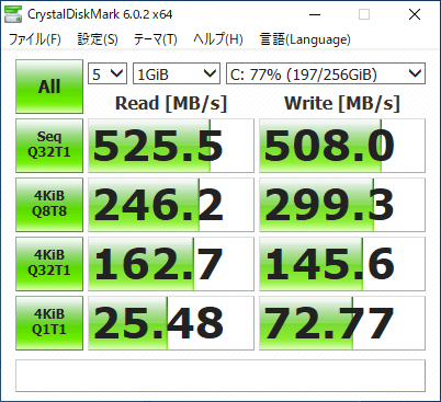 BX500 120GBの公称値はシーケンシャル読み取りで540MB/s、シーケンシャル書き込みで500MB/sとなっている。このSATA接続のSSDはSATA3で動いている。なので 実効転送速度は600MB/s ほどなので読み取り、書き込みともに十分なスペックではないだろうか。