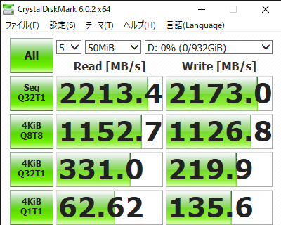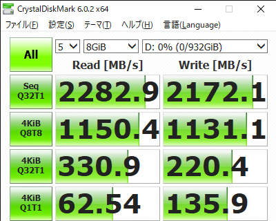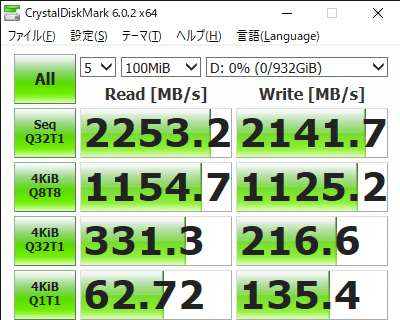 50MiBから32GiBまで読み書き速度が安定しており、どの容量でもメーカー公称値を上回っている。キャッシュが切れる様子はなく、100GBのデータを書き込んでも速度を維持することができていた(SSDの空き容量による)。やはりIntelCPUの脆弱性修正パッチの影響からからかAMD環境のほうが全体的に速い。ただし4KiB Q32T1(分散した領域へデータを4KiBごとに分割し、32個の命令を1本として処理する方法)の値のみIntel環境が30%程早く読み書きしている。